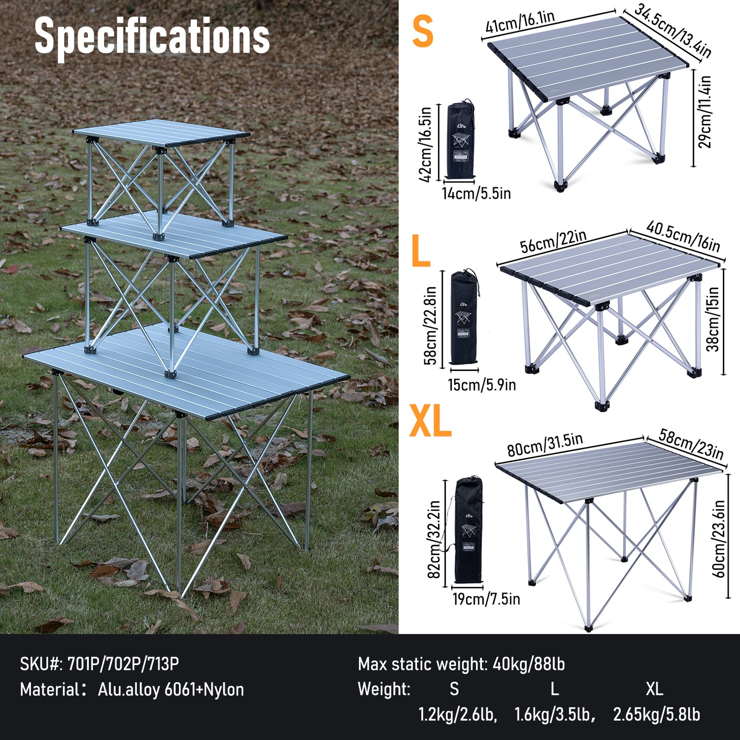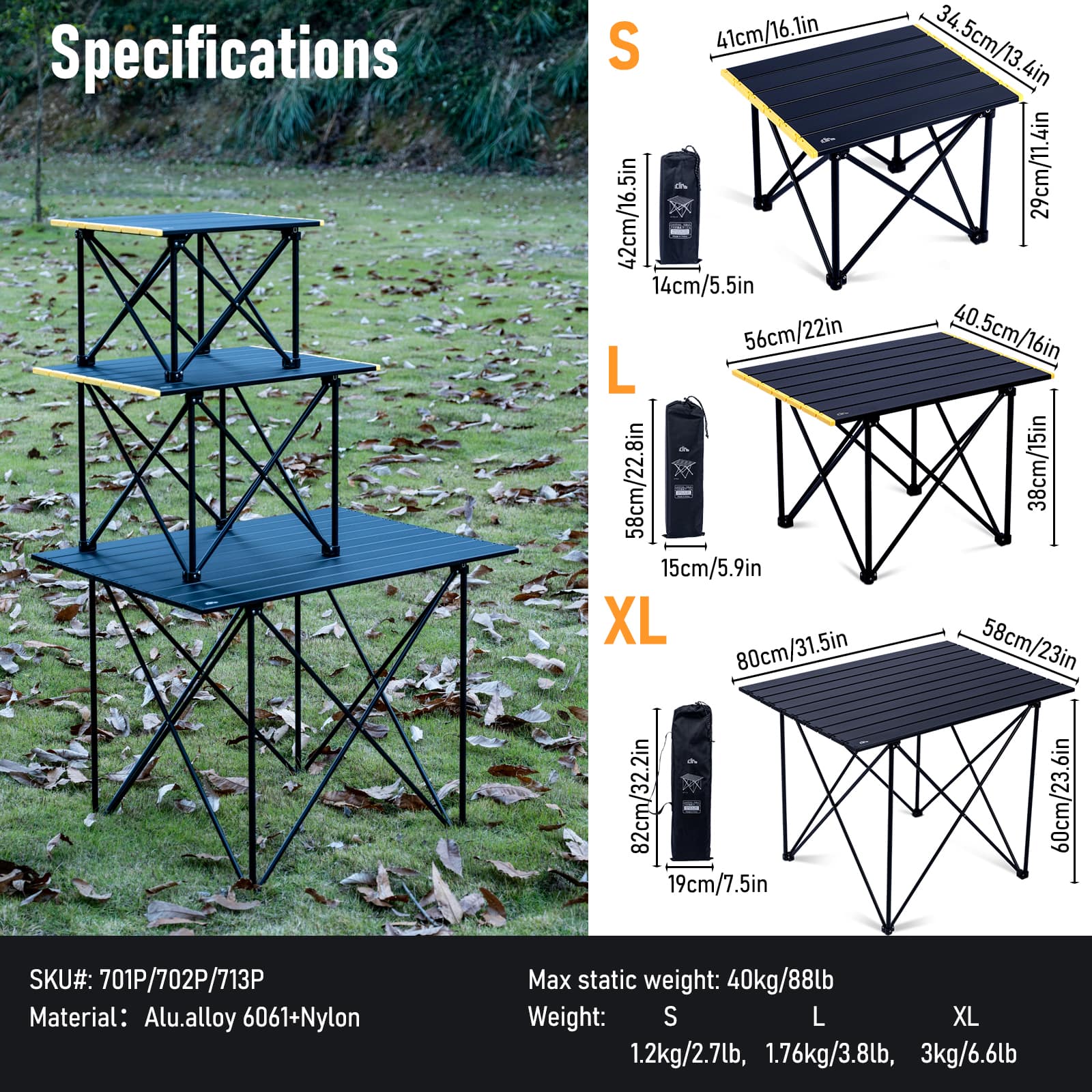 航空宇宙グレードのアルミニウム合金製で超軽量です。最大積載量40kg(88ポンド)。木製やナイロン製の天板のテーブルとは異なり、このテーブルは耐久性があり、防水性、耐腐食性があり、お手入れも簡単です。頑丈なジョイントとコネクター、さらに滑り止めゴム足により、このテーブルはより安定し、脚が異なる地形でも折りたたまれたり、曲がったり、外れたりすることはありません。セットアップは非常に簡単で、ベースフレームを開いて天板を取り付けるだけで、数秒でレジャータイムを楽しむことができます。