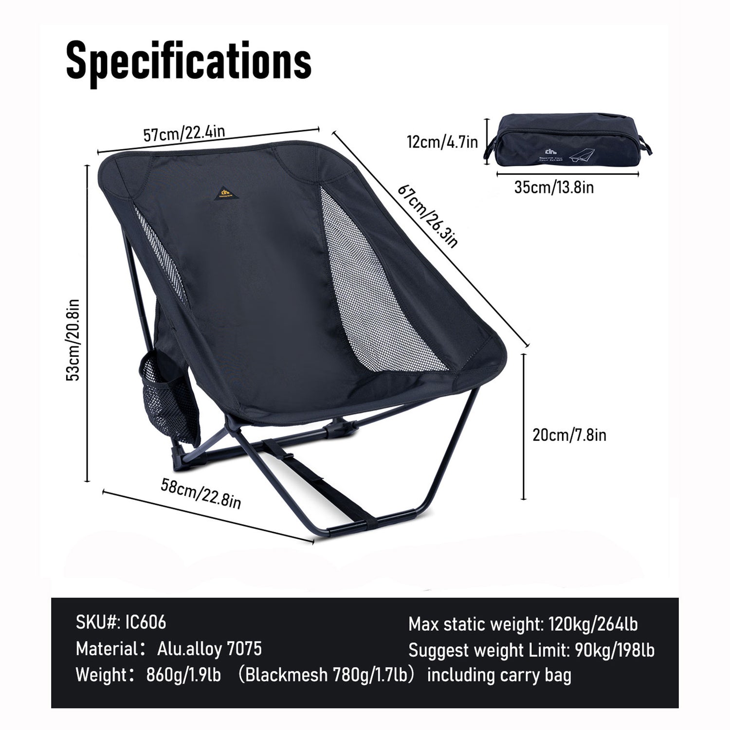 Ultralight but heavy duty, made of aerospace-grade aluminum alloy 7075 and 900D ripstop oxford, only weighs 860 g (1.9 lbs), supports up to 120 kg (264 lbs ), Considering the impact while sitting, suggest for people under 90 kg (198 lbs); All 4 corners at the back of seat fabric are reinforced (Bartack Sewing) to ensure reliability; Corrosion-resistant, easy to clean.
